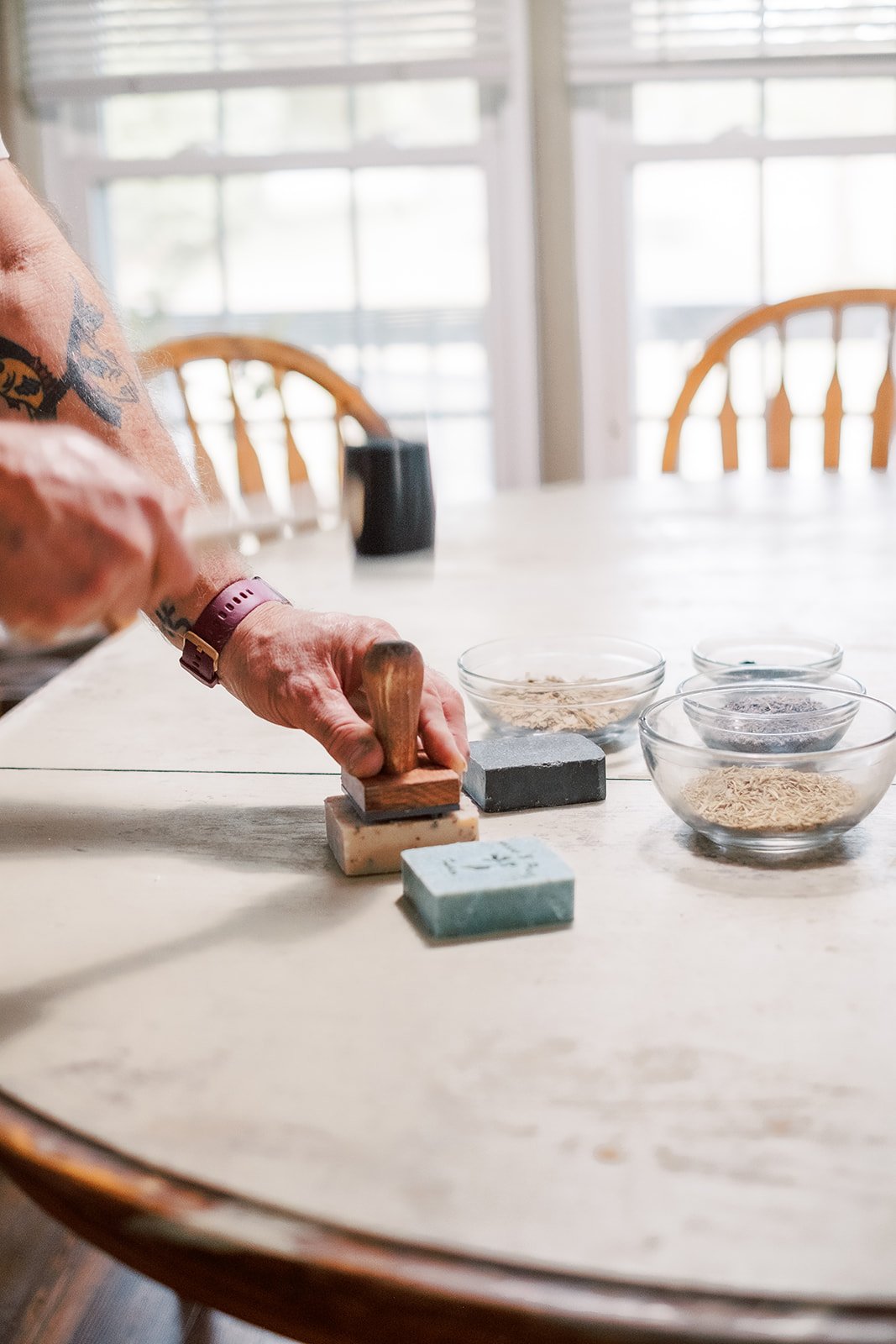 The day of the shoot was so exciting! Lisa and Kenny had closed down the shop but invited some of their customers in to capture authentic interaction inside the shop. We took photos in, and in front of, the shop for about an hour before we moved on to the farm. At the farm, I got to watch some of the process of making and stamping the soap in addition to getting a tour of the farm and my favorite part - meeting all the animals! Seeing the full process firsthand made it clear how much care and intention goes into every product they create.